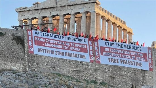 في مشهد لافت من قلب العاصمة اليونانية أثينا، علّق أعضاء من الحزب الشيوعي اليوناني “KKE”، الجمعة، لافتتين كبيرتين على جدران معبد أكروبوليس الأثري الشهير، تعبيرًا عن […]