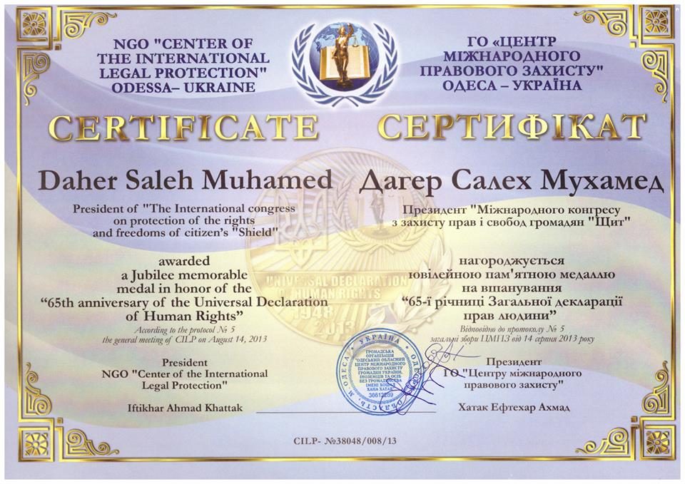 كرم المركز الدولي للدفاع عن حقوق الانسان الدكتور صالح محمد ظاهر رئيس ومؤسس منظمة الدرع العالمية وسام المركز وشهادة تقدير بمناسبة الذكرى ٦٥ للاعلان العالمي لحقوق […]